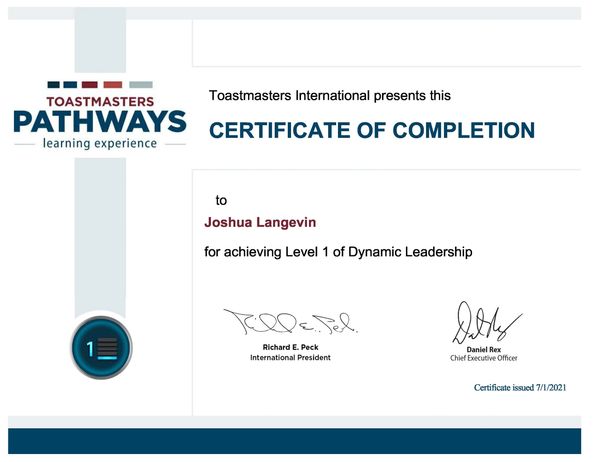 Joshua completed Level 1 in his Dynamic Leadership Path!